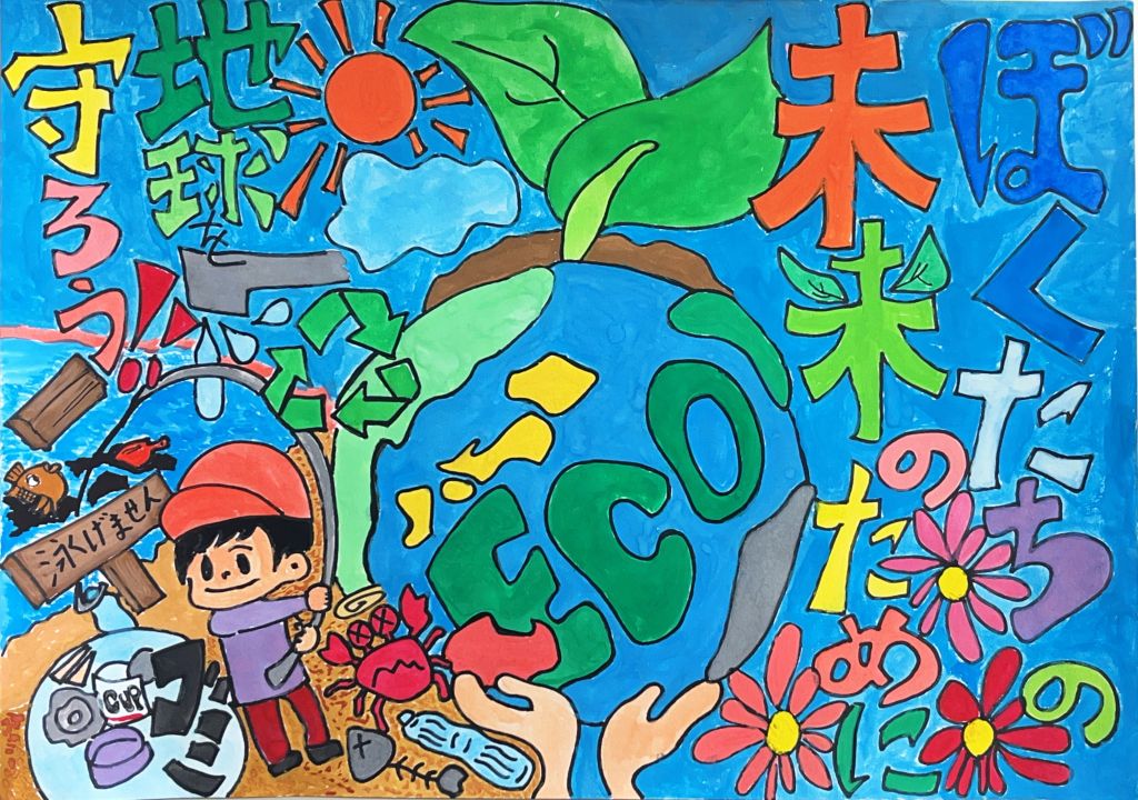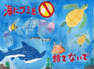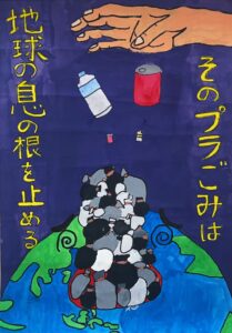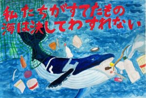 最優秀賞を受賞した作品は、絵の中心となるクジラの曲がり具合、動きがあって非常に力強い表になっていました。「私たちがすてたもの 海は決してわすれない」という言葉も力強く、海の中の生き物に同化して、クジラの気持ちを察していました。明るすぎない色の配色もとても良かったです。