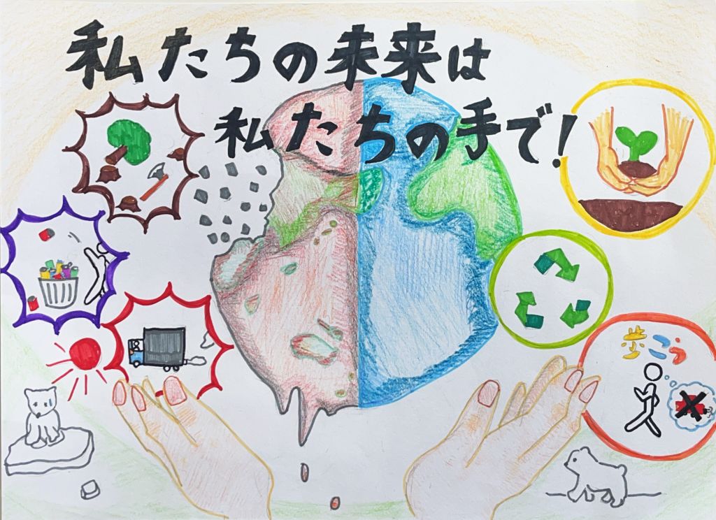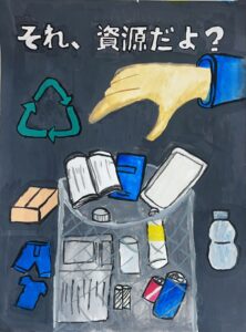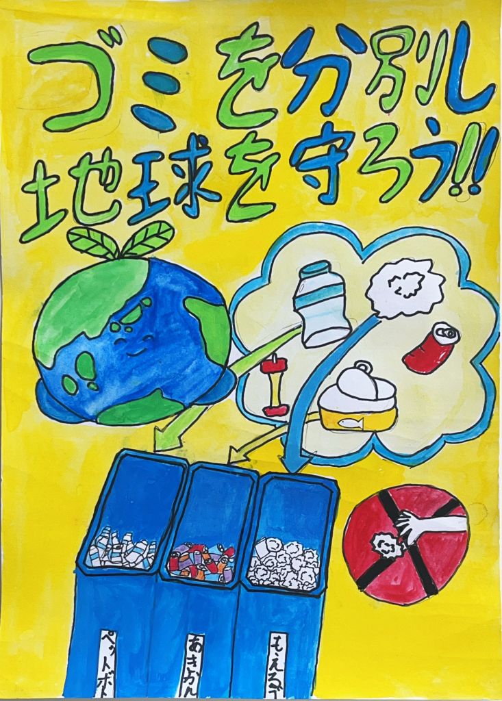 優秀賞を受賞した作品は、絵も文字も美しく、説得力がありました。分別することが地球を守ることにつながることを分かり易く表現しています。このポスターを見れば、大人だけでなく、子どももみんなが家庭で分別する意識を育てることになりそうです。